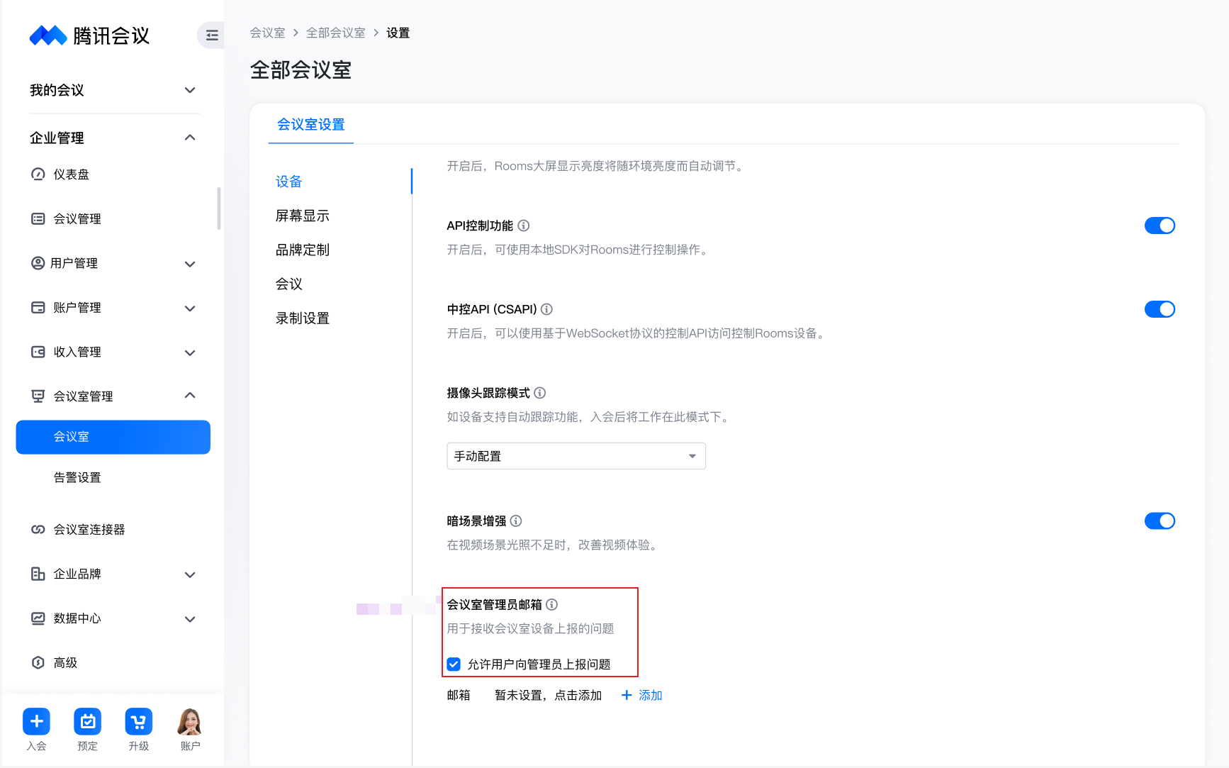 1. 可在腾讯会议官网 > 会议室管理 > 会议室 > 会议室设置 > 设备中,打开允许用户向管理员上报问题,并输入会议室管理员邮箱用于接收该会议室设备上报的问题通知。