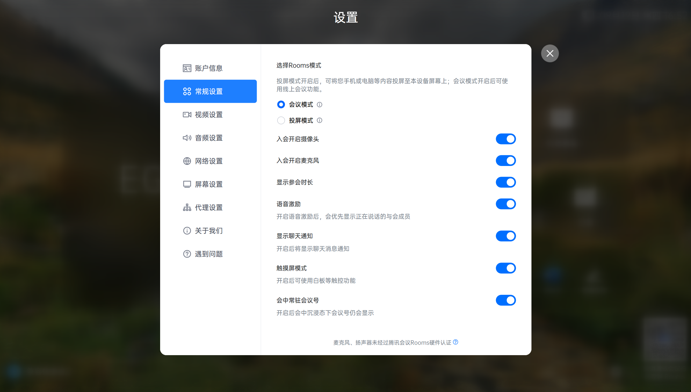 选择 Rooms 模式:勾选会议模式或者投屏模式。