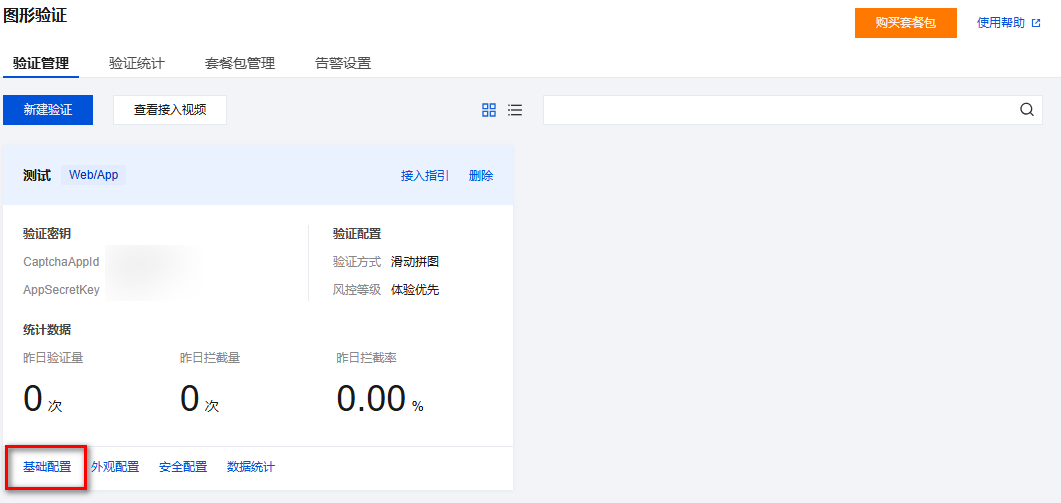 1. 登录 验证码控制台,左侧导航栏选择图形验证 > 验证管理。