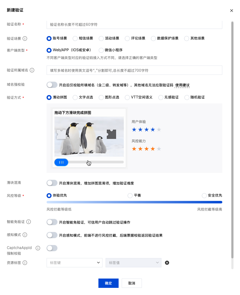 验证方式 | 可选择滑动拼图、文字点选等验证方式。 | 仅滑块拼图支持滑块混淆模式。 微信小程序暂不支持修改风控等级。 无感验证不支持智能免验证及感知模式。 VTT 空间语义不支持智能免验证及感知模式。 在感知模式或选择无感验证方式时支持开启风险获取拦截类型功能。 |