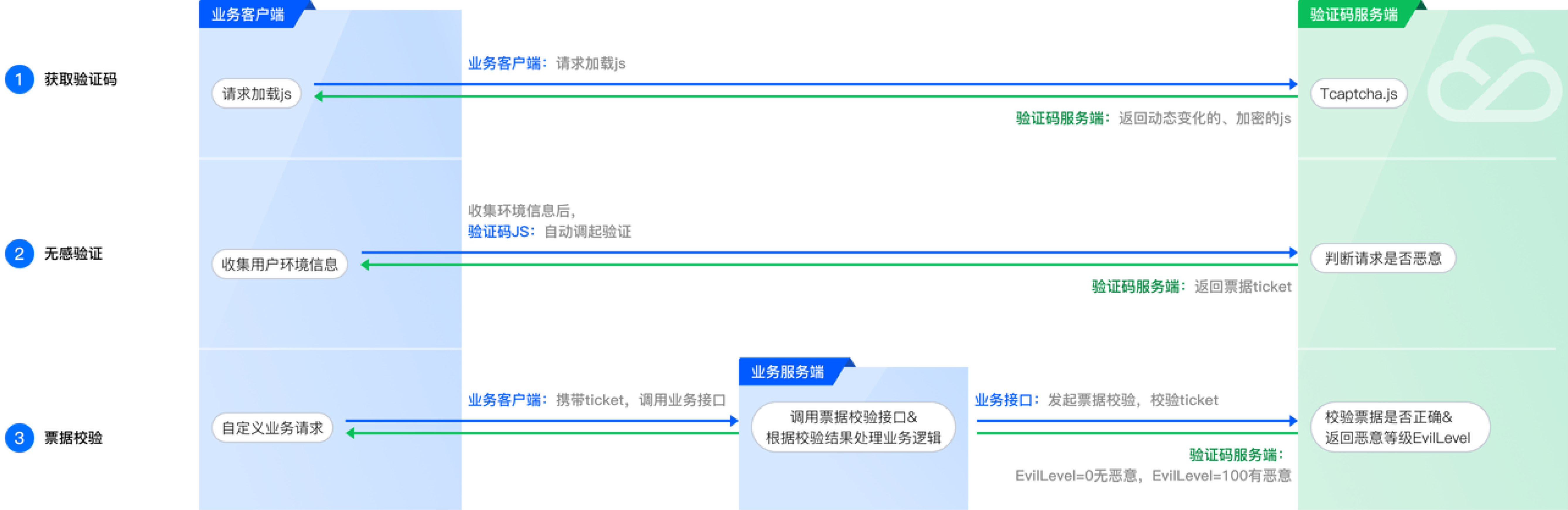 无感验证方式下,票据校验 API 返回的 EvilLevel 参数值代表了请求是否有恶意。