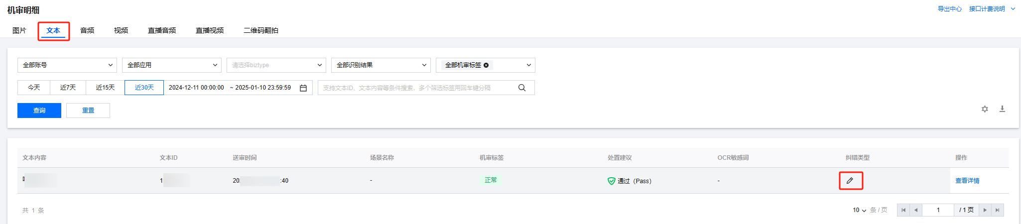 2. 在机审明细的文本页面,找到需要纠错案例,单击纠错类型列的