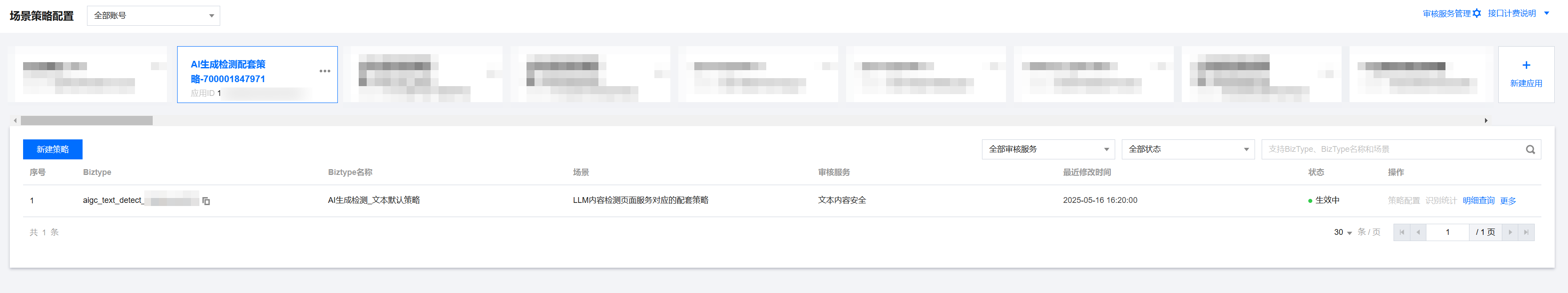 2. 获取接口参数:单击“应用管理”,即可见如下图所示的“AI 生成检测配套策略”,其中 Biztype 字段对应的值,即接口调用的必备传值。