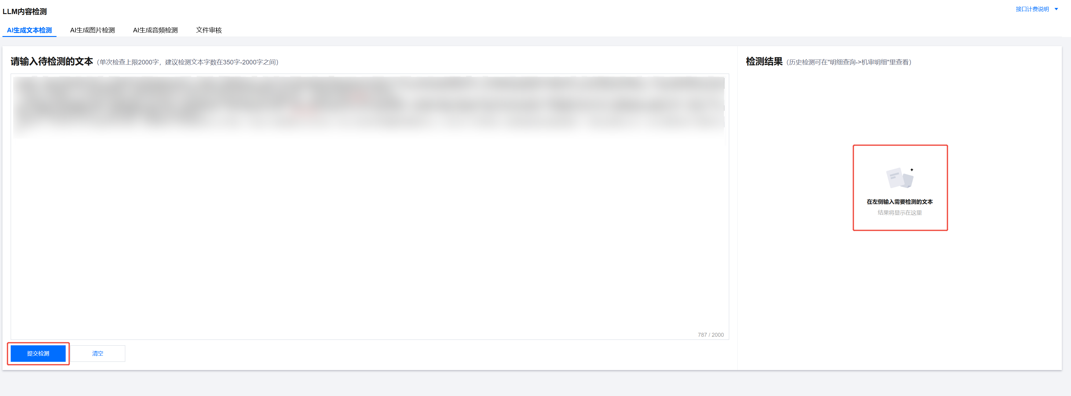 3. 输入待检测文本后,单击提交检测,即可查看检测结果与生成说明。