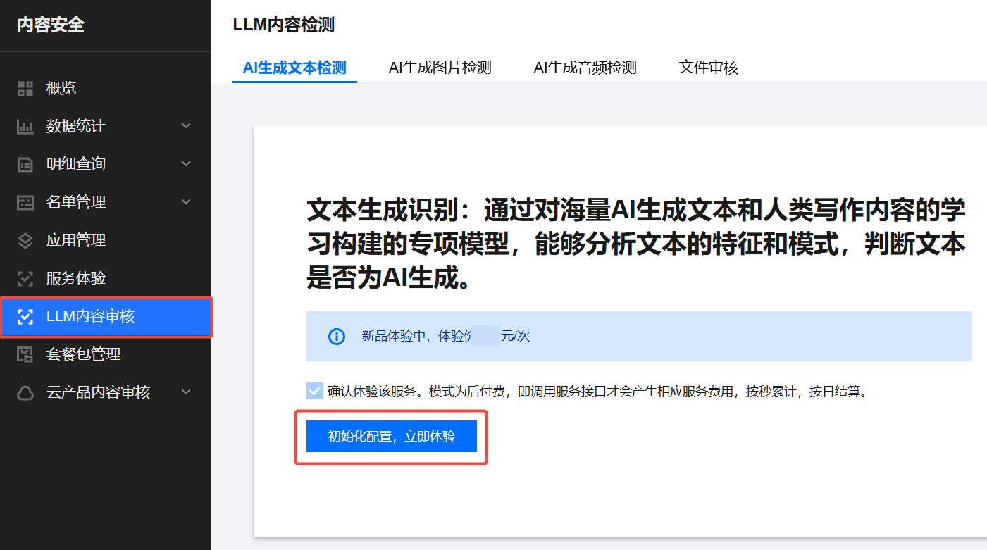 1. 开通服务:登录 内容安全控制台,单击 LLM 内容审核,跳转后单击初始化配置,立即体验。
