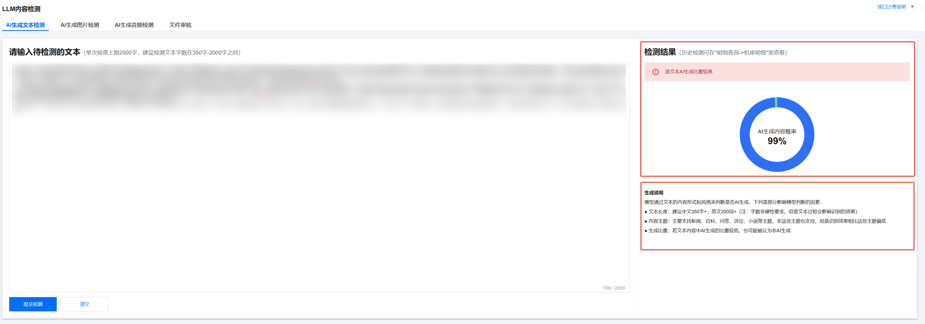 AI 文本生成识别单次检查上限2000字,同时过短的文字也难以证明是否为 AI 生成,因此建议检测文本字数在350字-2000字之间。