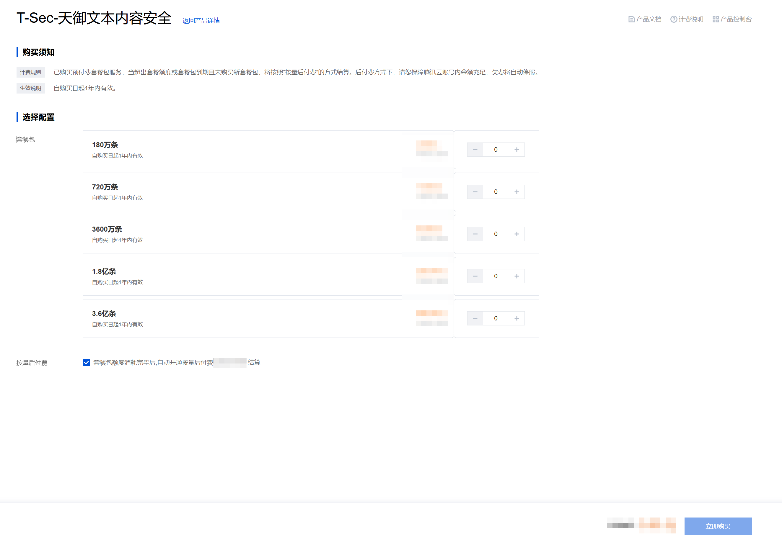 1. 进入 文本内容安全购买页,根据实际使用的需求选择相应套餐包(可同时选择多个套餐包),单击立刻购买。