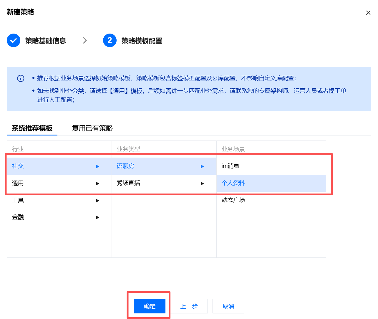 5. 在策略模板配置页面,根据具体业务选择对应的行业、业务类型、业务场景,并点击确定引用模板保存,即可完成策略创建。