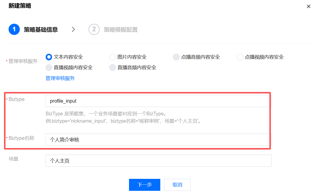 4. 在新建策略页面,选择文本内容安全,根据业务输入 Biztype、Biztype 名称、场景,单击下一步进入策略模板配置。