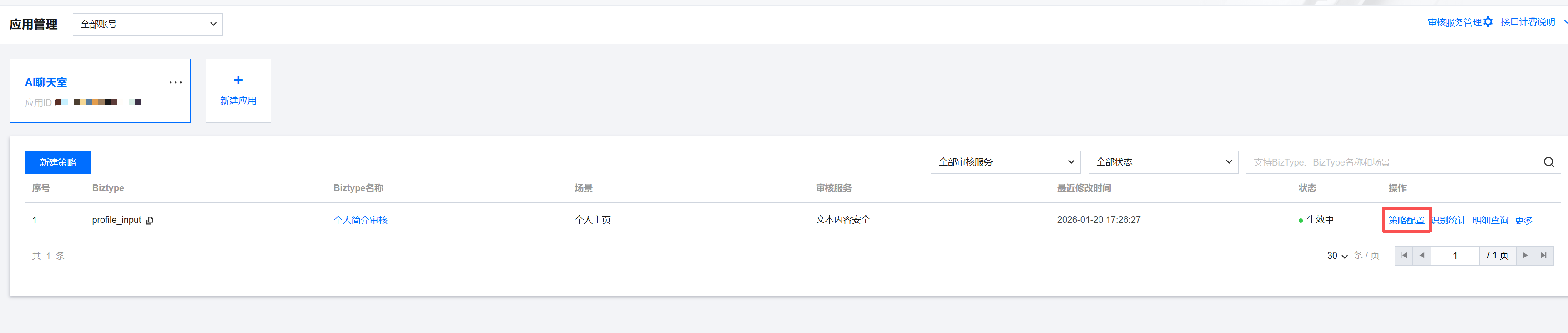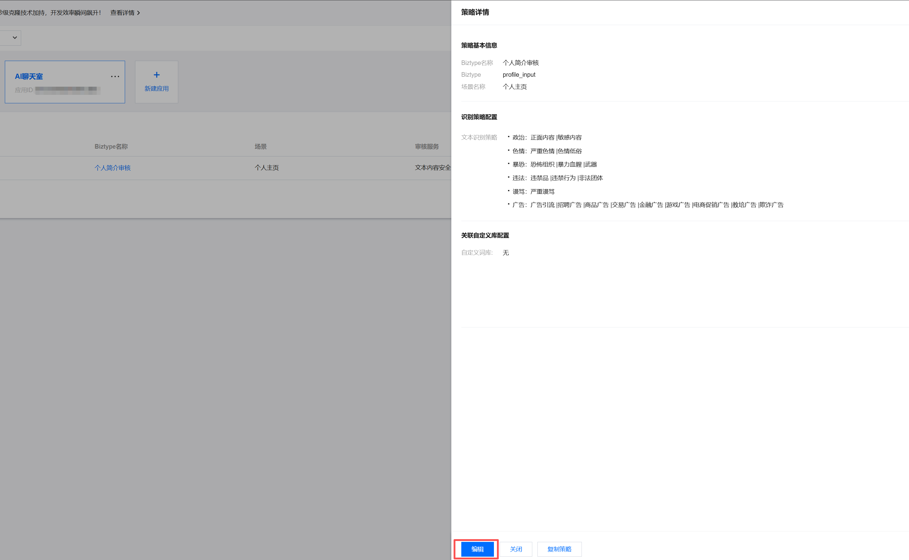 策略是业务下内容安全的规则集,包含风险识别模型和关键词库。在一个应用中,可根据不同的场景配置多条策略。