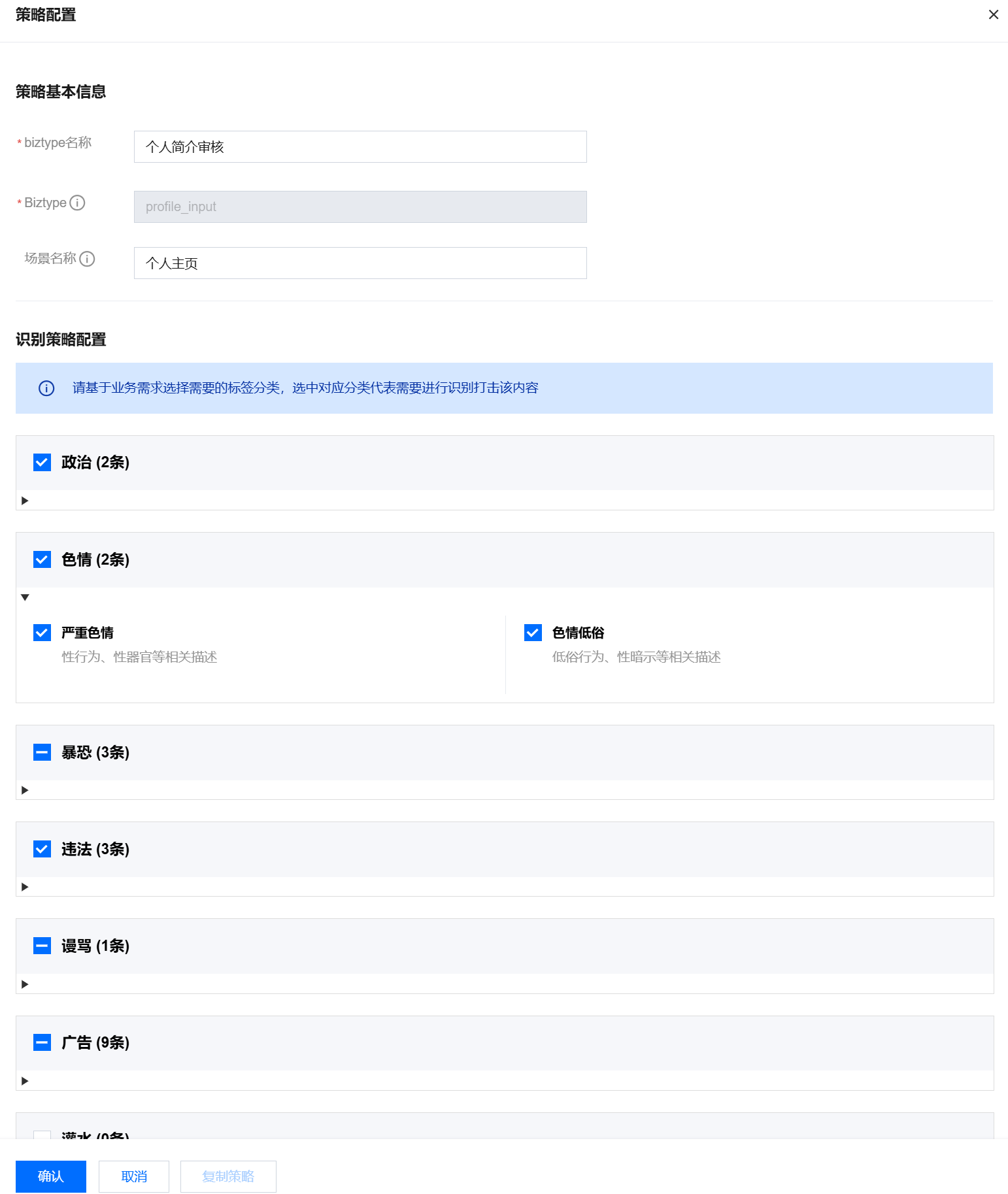 单击确认引用模板后,策略配置页面会刷新成对应的标签和词库模板配置(如谩骂、色情、暴恐、广告等)。