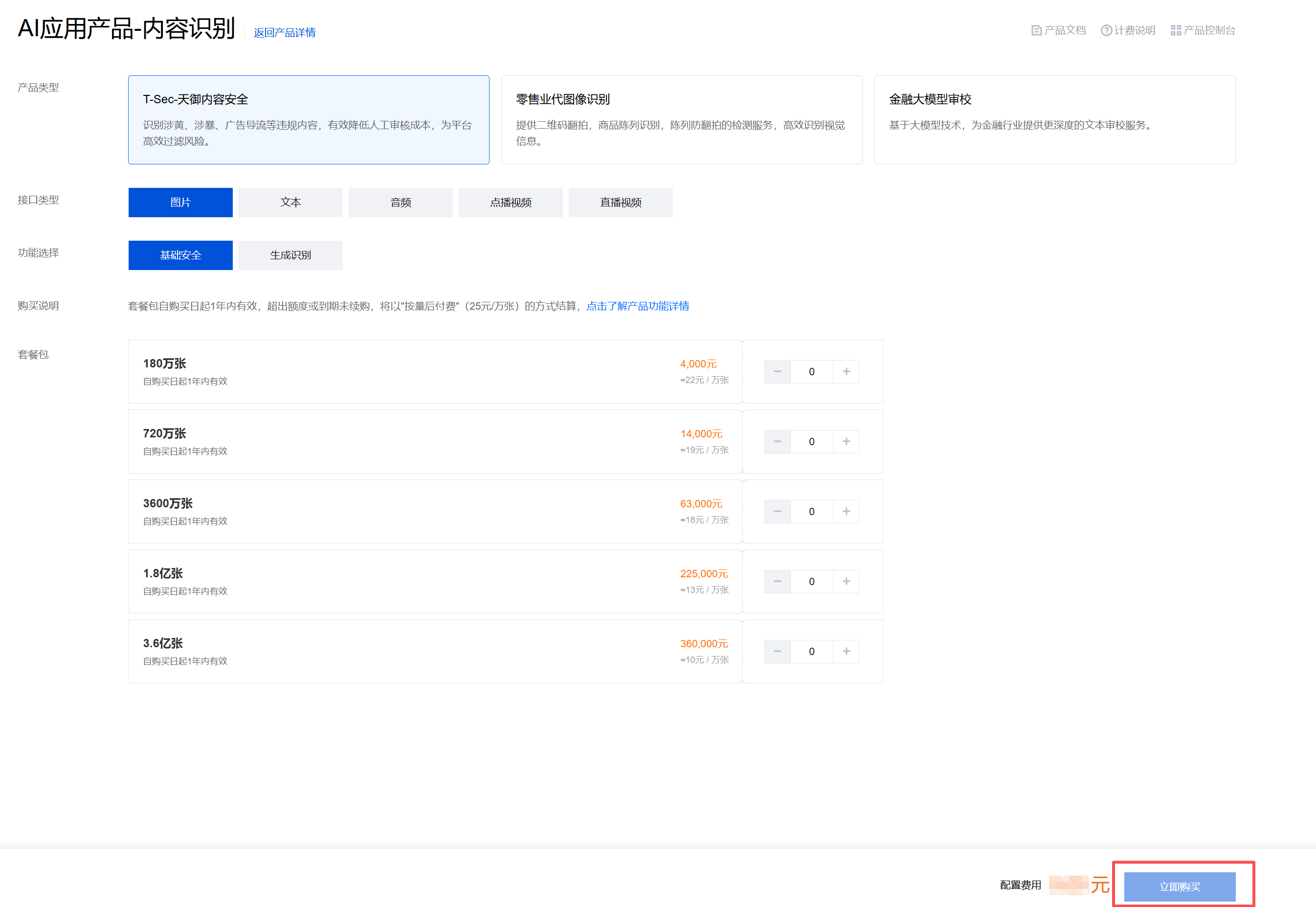 1. 进入 图片内容安全购买页,根据实际使用的需求选择相应套餐包(可同时选择多个套餐包),单击立刻购买。