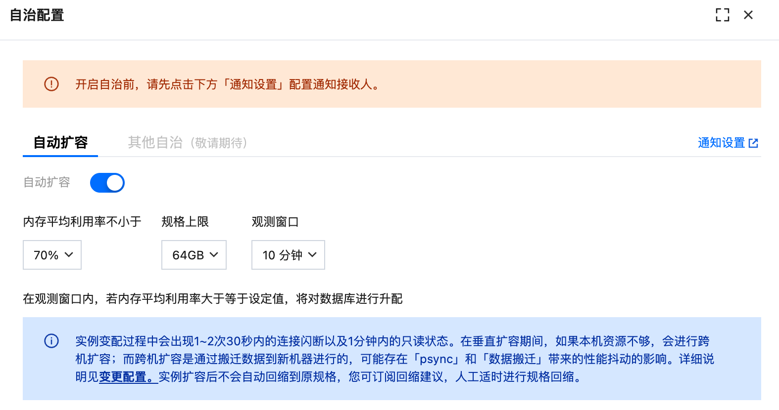 关闭当前实例的自动扩容自治任务 | 在页面右上方单击自治配置,在右侧弹框关闭自动扩容按钮,单击保存。 ![]() |