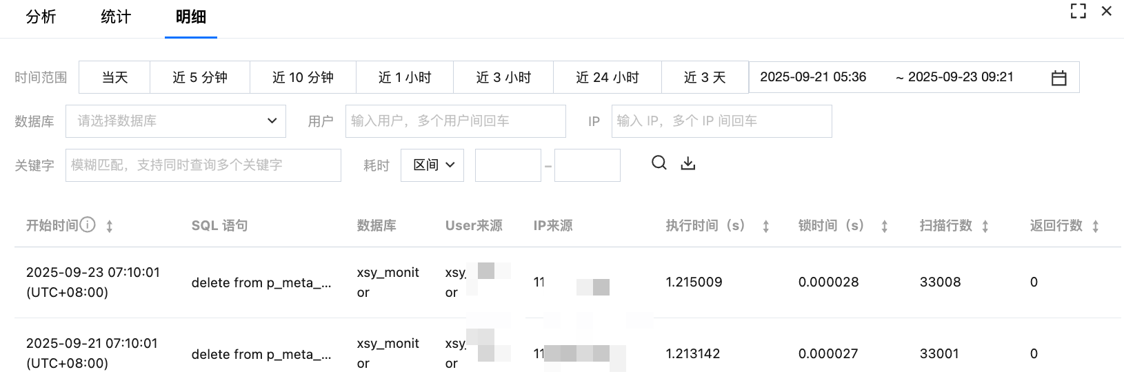 long_query_time 参数设置的值时,对应的 SQL 语句会在慢 SQL 分析页面进行统计。查看慢 SQL 分析