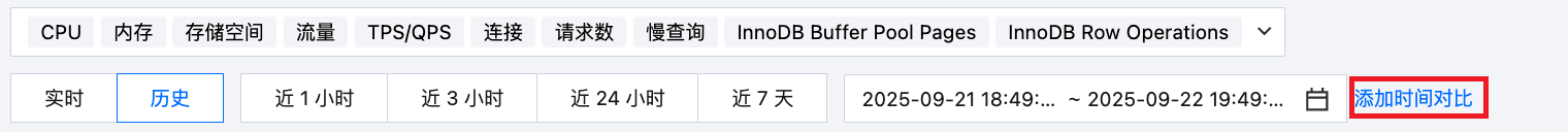 单击添加时间对比,选定所关注的对比时间段,可以查看多性能指标趋势的时间对比。