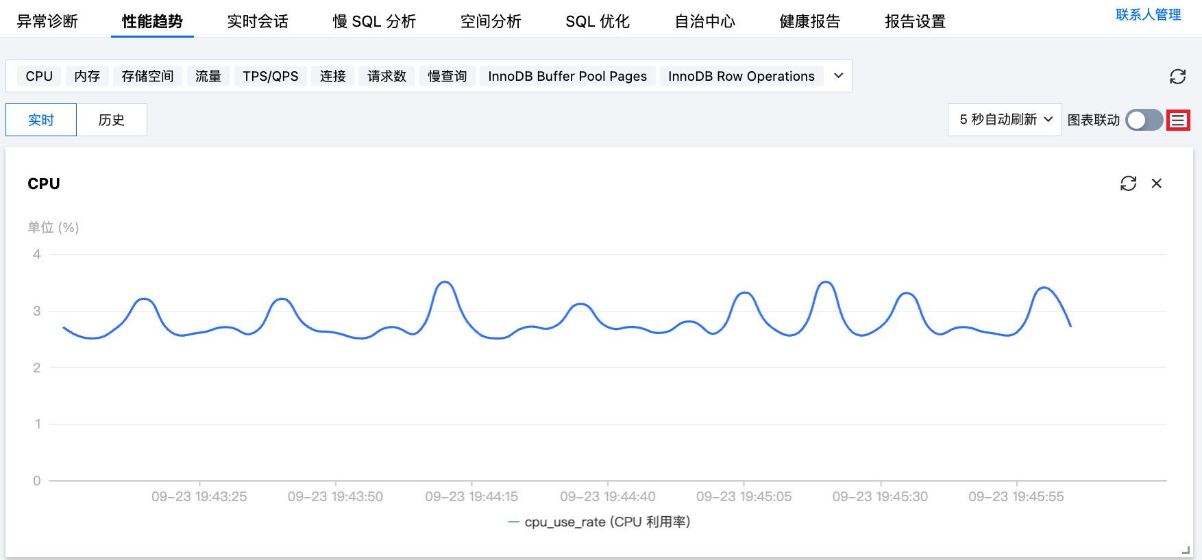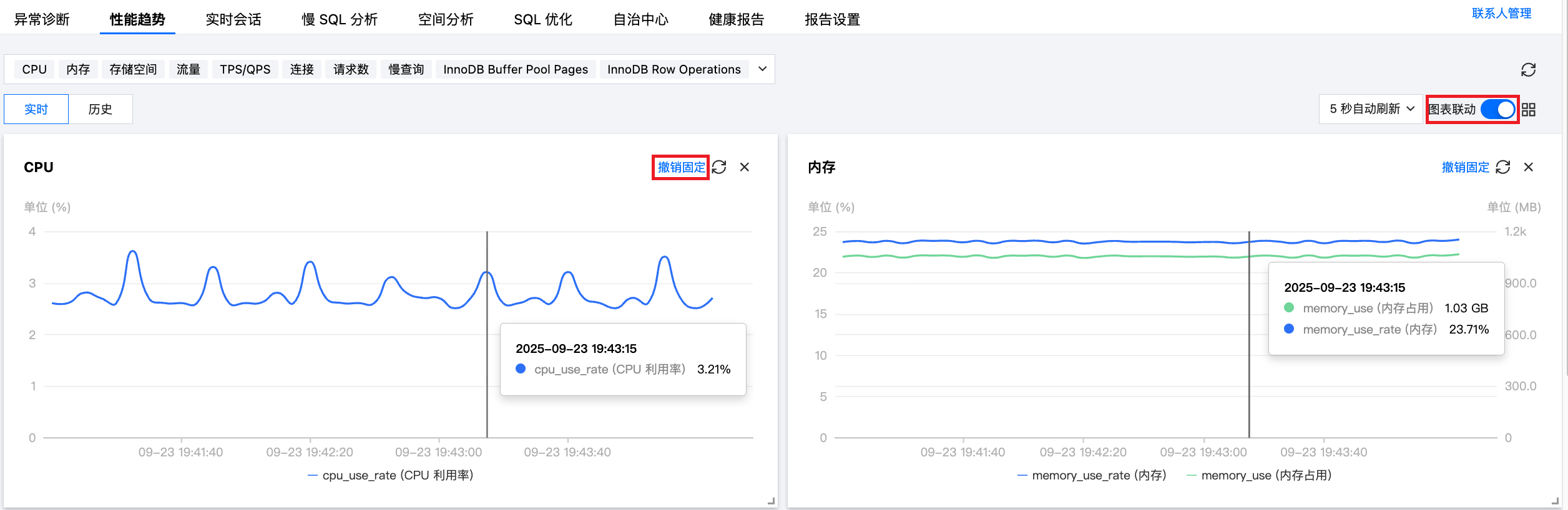 实时性能趋势视图:用户可以查看实例的性能趋势状况,默认开启5秒自动刷新,还支持选择15秒、30秒自动刷新,并支持选择不自动刷新。
