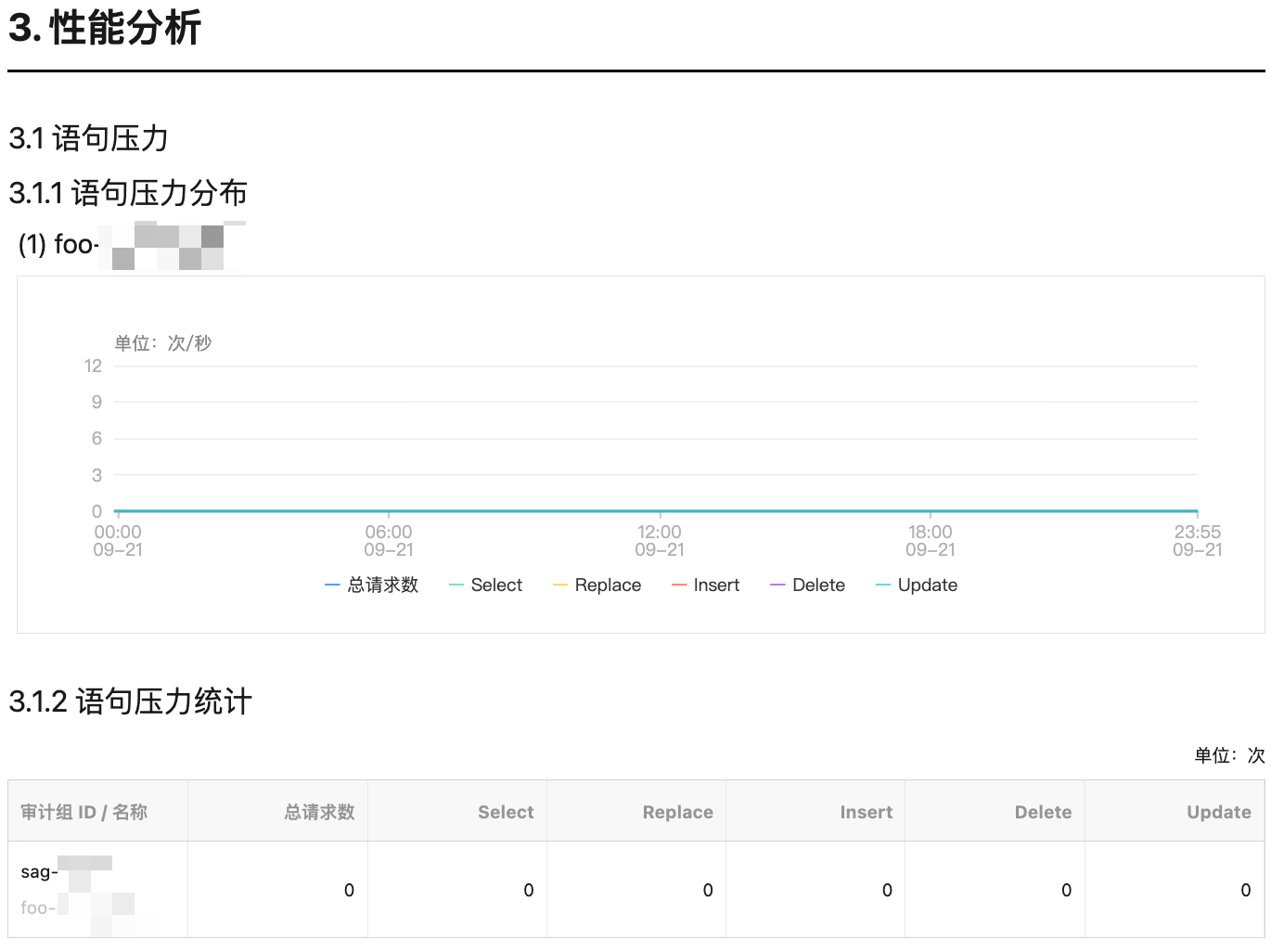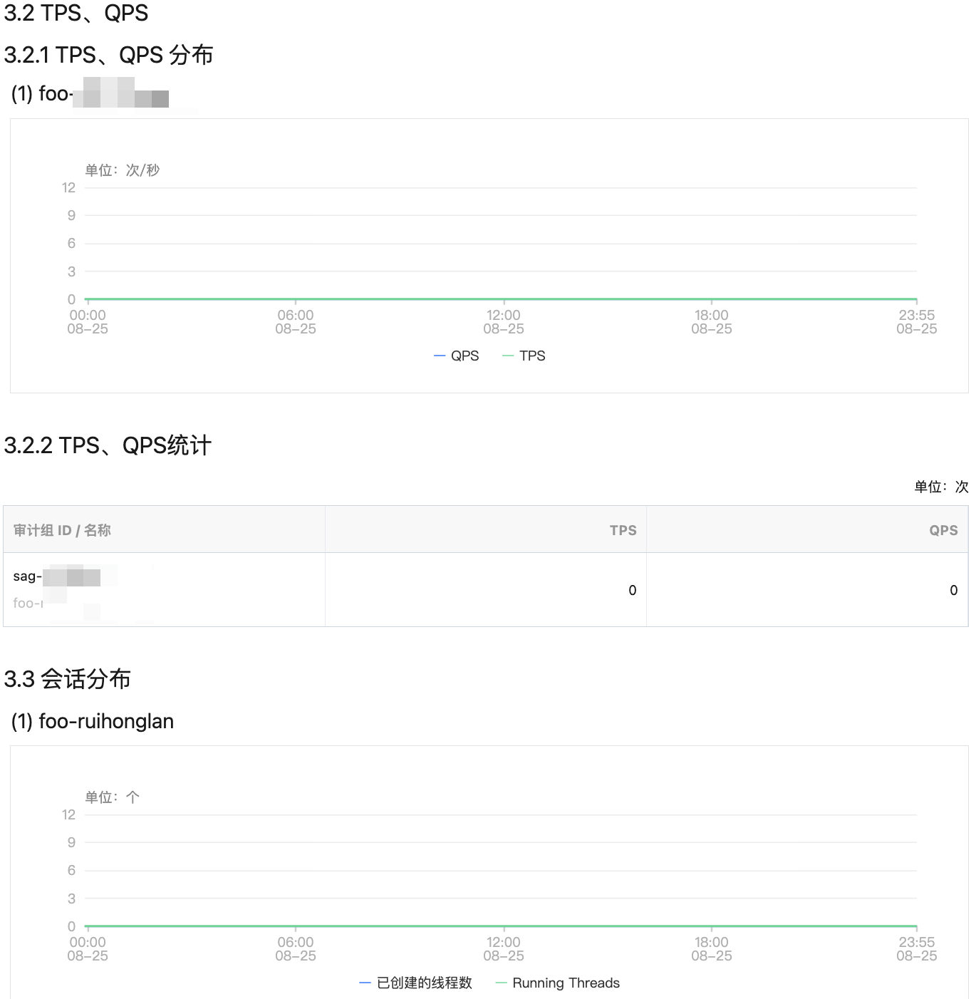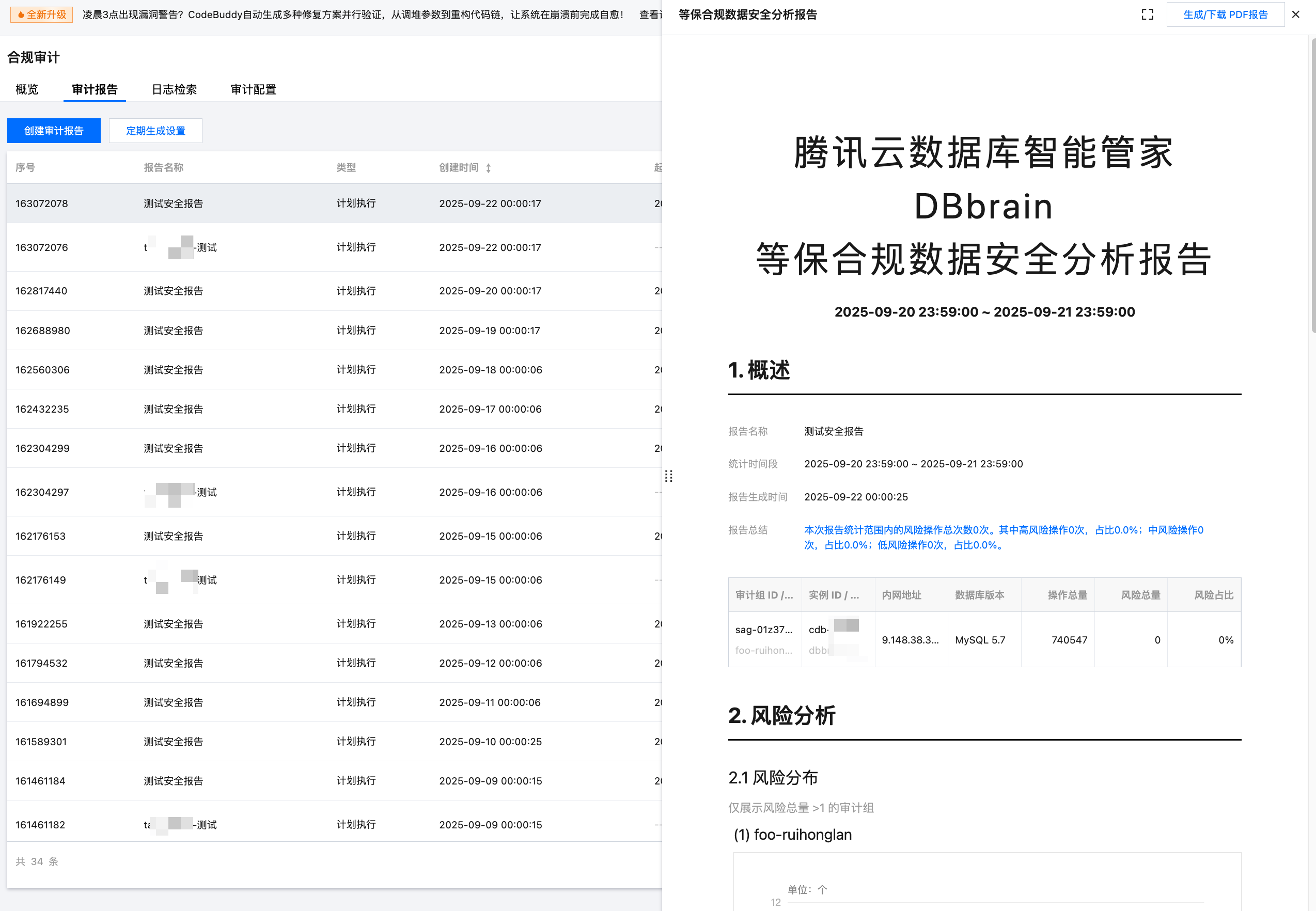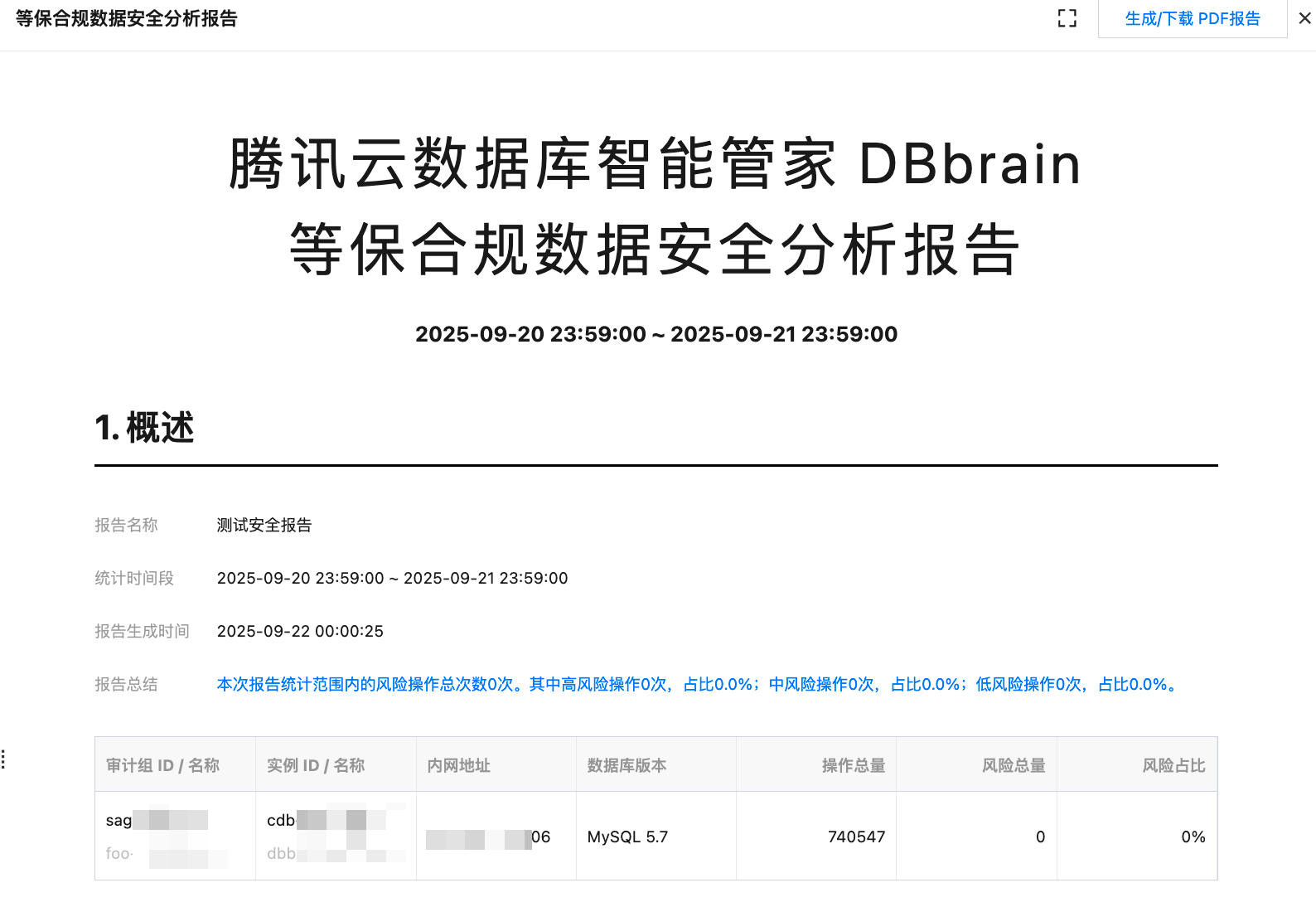 DBbrain 等保合规数据安全分析报告展示了 DBbrain 对用户所选的审计组,在指定时间范围内整体风险状况。主要包括审计组所包含实例的基本信息、操作总量、风险总量、风险占比、风险分析(风险分布及统计)、性能分析(语句压力分布及统计)、TPS/QPS 分布及统计,会话分布等。