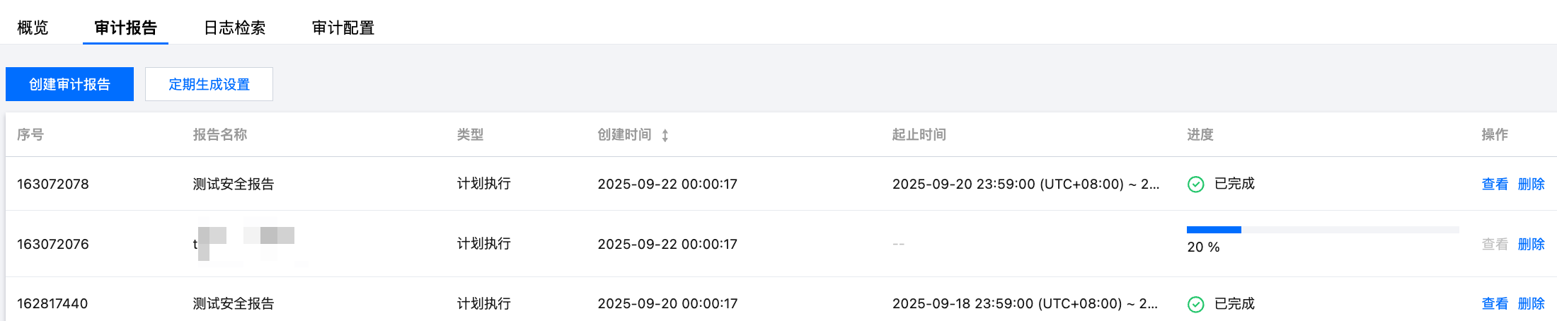 可查看每个审计报告任务的报告名称、类型(包括手动触发和计划执行)、创建时间、起止时间、进度以及操作。