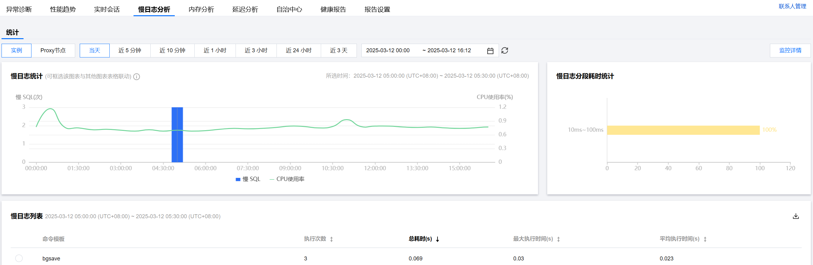 实例(Redis 数据库实例)维度,可以清晰地看到 CPU 使用率,慢查询数、日志分段耗时统计结果,和整个慢日志列表的列表信息。