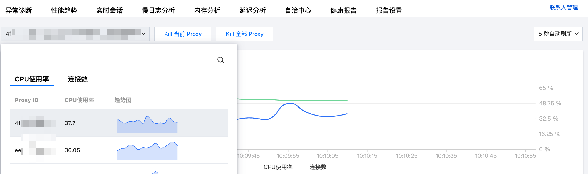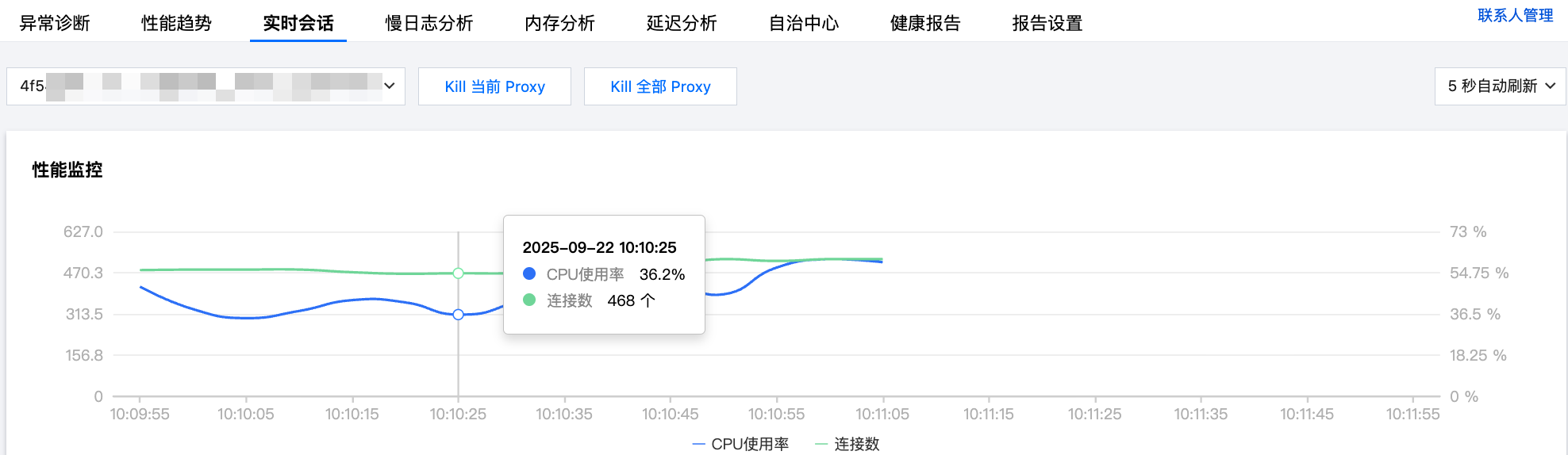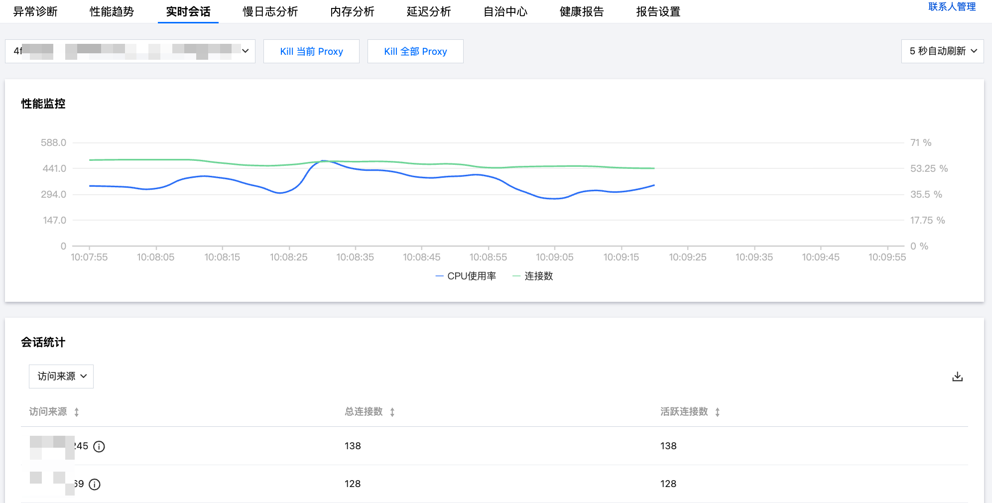 实时会话聚焦数据库实例 Proxy 节点 CPU 使用率与客户端的连接数量这两项关键指标,持续动态展示这两项关键指标的变化趋势,且持续统计数据库会话、访问来源、活跃连接数等数据,并支持 Kill 当前 Proxy 或全部 Proxy 会话。
