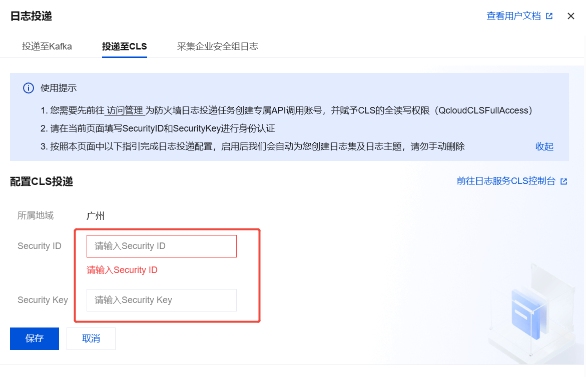 6. 在投递至CLS页面,单击配置 CLS 投递的编辑,填写 SecurityID 和 SecurityKey 进行身份认证,单击保存,完成 CLS 投递的配置。