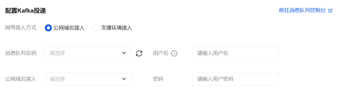 方式1:选择公网域名接入,选择消息队列实例和公网域名,并输入所选消息队列实例的用户名和密码。