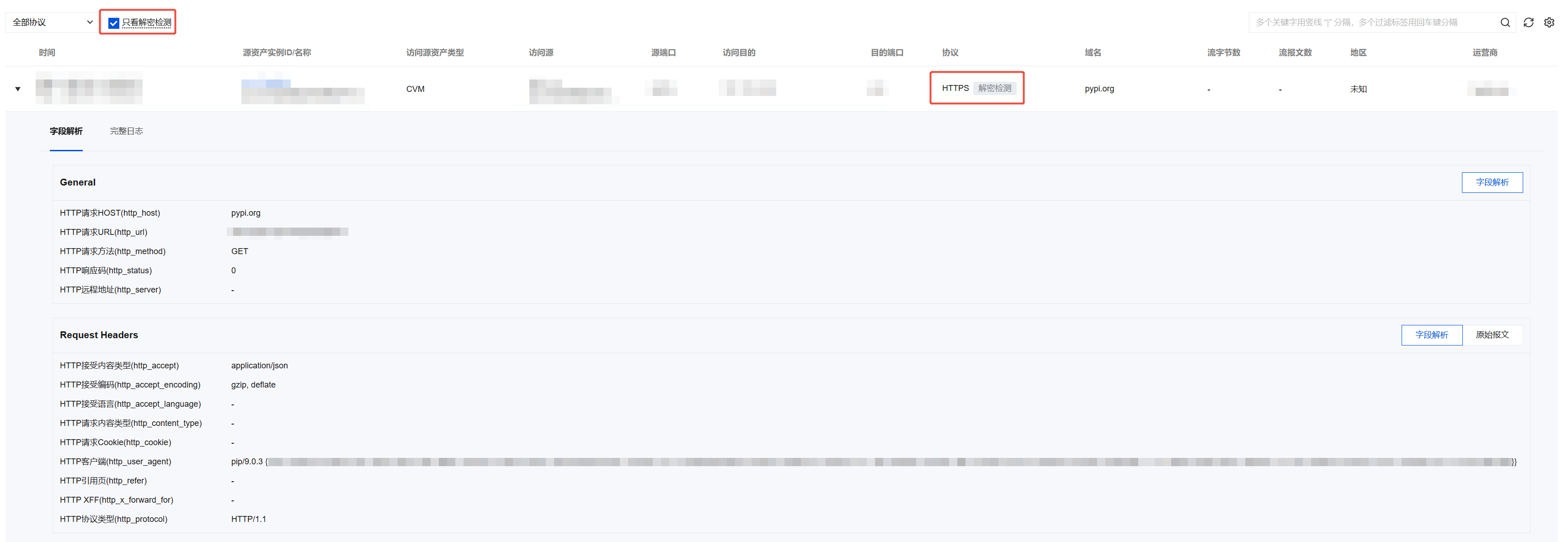 在日志审计 > 全流量检测与响应日志 > 流量分析日志 或 流量告警日志页面,针对 HTTPS、SMTPS、FTPS 等加密协议的流量日志,会先将其还原出明文内容(如请求头、响应体等字段),并在旁边标注解密检测;您还可通过勾选只看解密检测选项,快速筛选查看所有加密流量检测相关日志。