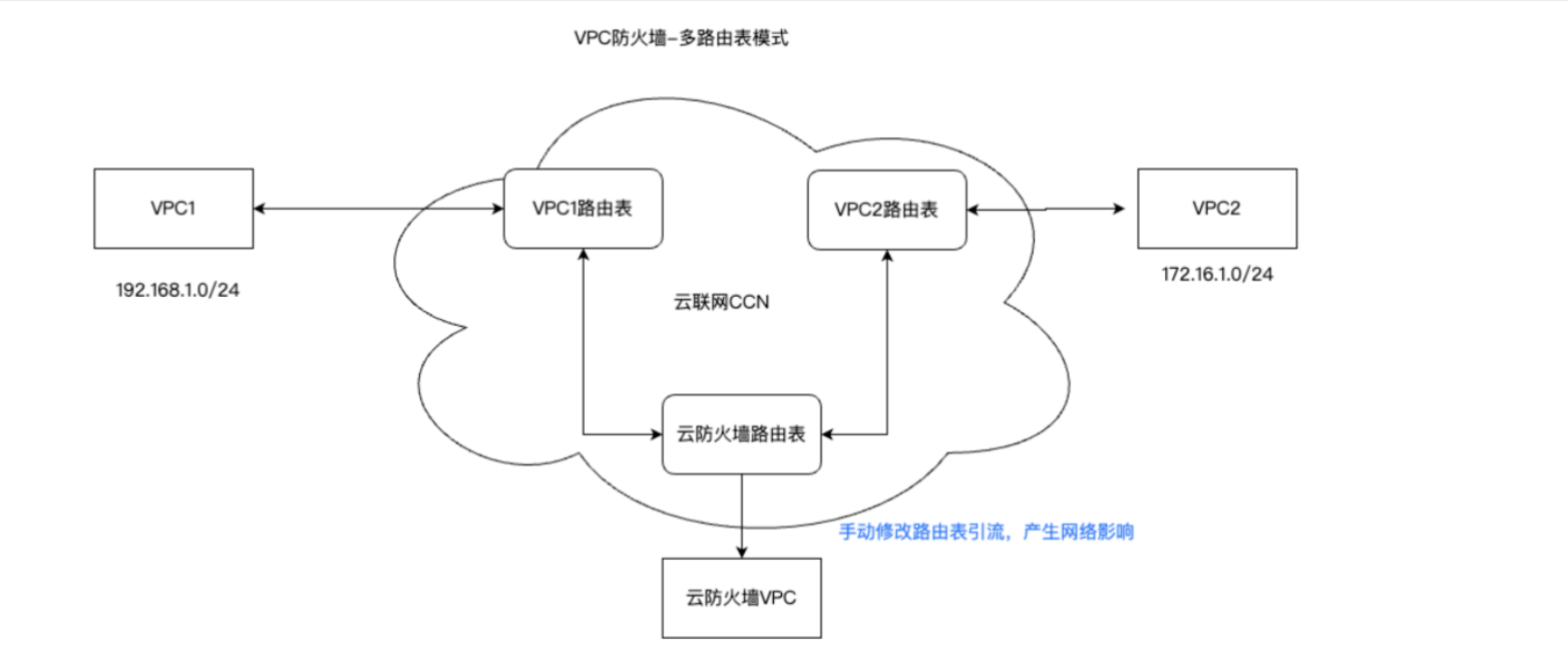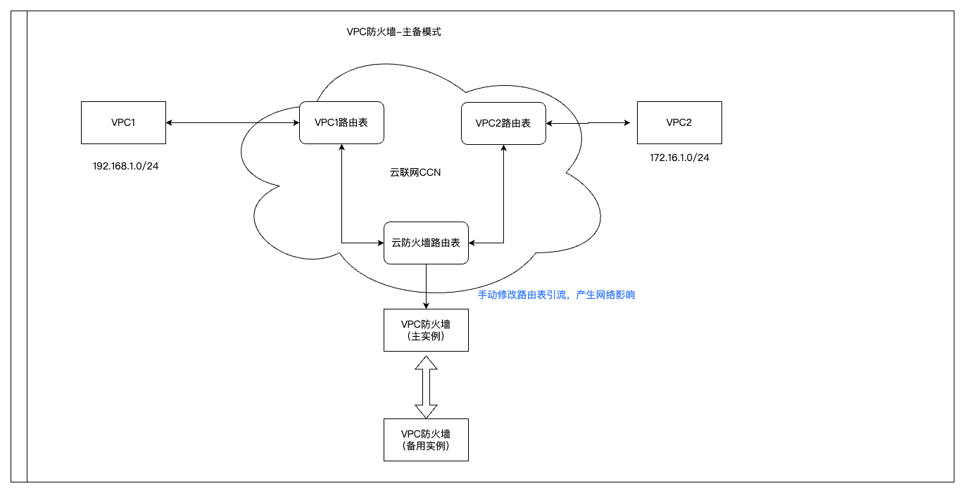 VPC 边界防火墙(主备模式)采用路由表引流模式,接入过程会涉及网络路由的调整,具体影响如下: