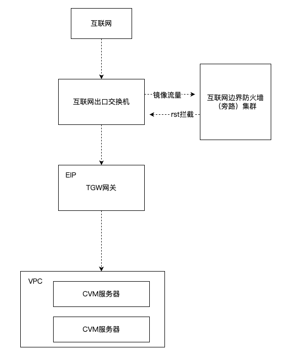 接入模式:防火墙以串行方式部署在云服务器(CVM)与现有 NAT 网关之间,作为流量清洗的中间跳点。 保留用户原有 NAT 网关架构,实现平滑安全加固。