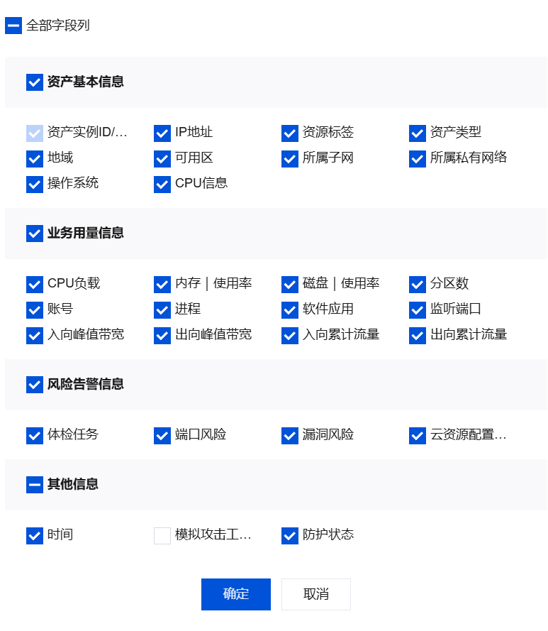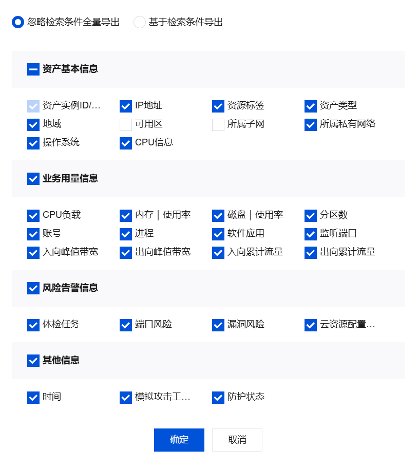 图标,可以导出资产列表,支持自定义列表内容与检索条件。