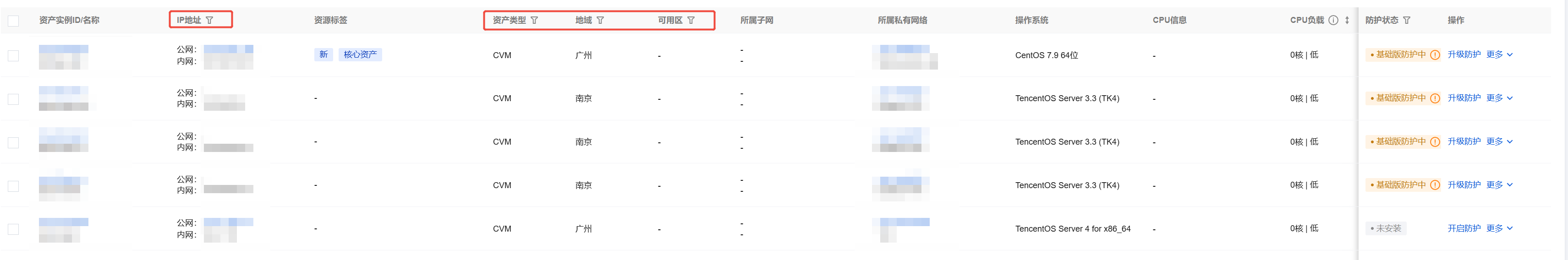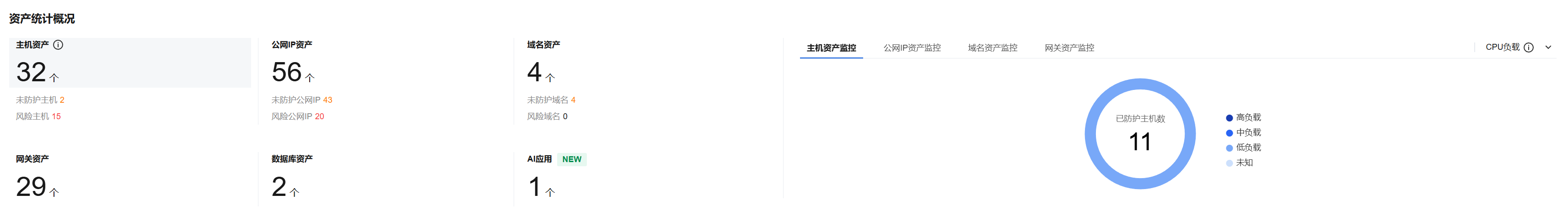 1. 查看资产统计概况,页面左侧包括主机资产、公网 IP 资产、域名资产、网关资产、数据库资产个数,单击数字,页面下方即可筛选对应资产列表,供用户查看资产详情。