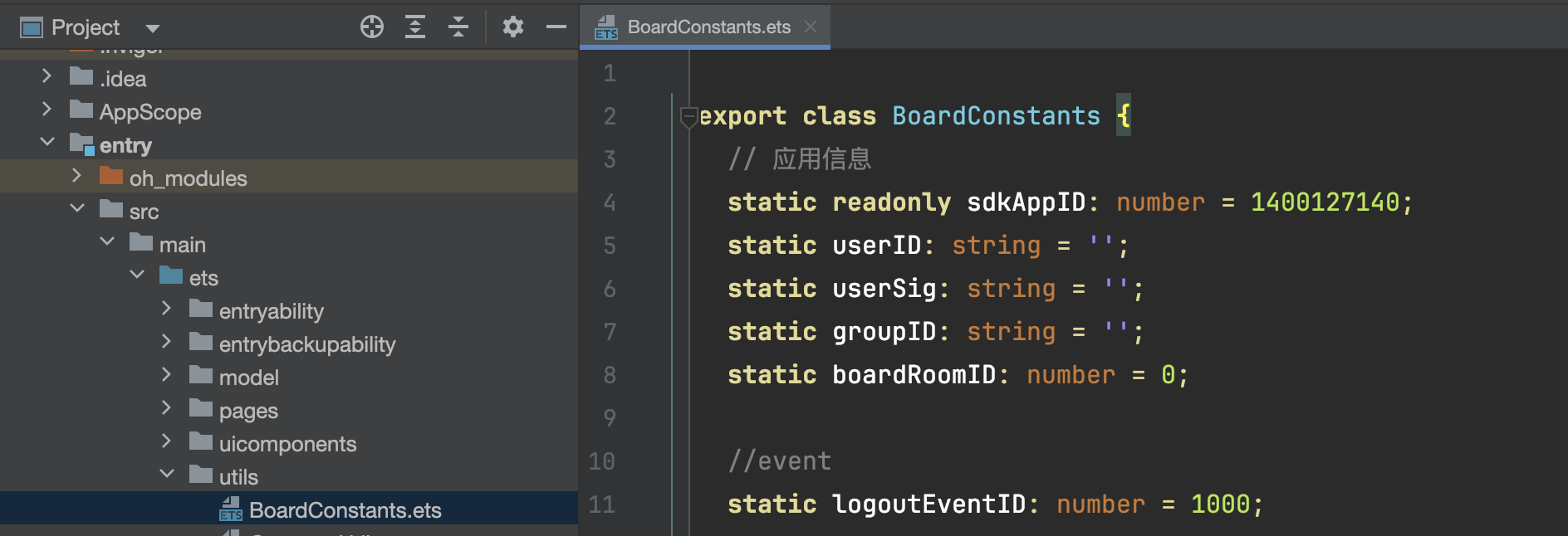 步骤三:打开 Demo 的配置文件 BoardConstants.ets,替换新的 SDKAppID 以及新创建的 UserId 和 UserSig(UserToken)即可。