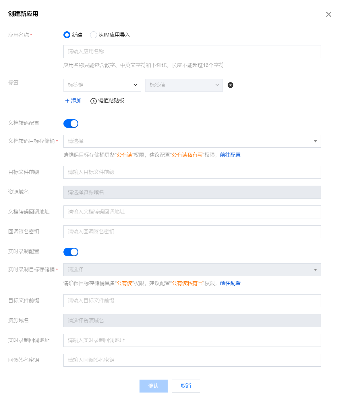 步骤三:您可以选择创建一个新应用或从已有的 IM 应用中导入,文档转码和实时录制资源存储桶配置请参考 存储桶配置,回调配置请参考 回调配置,如果您暂时不需要使用文档转码和实时录制功能,可以在创建应用对话框中关闭相应功能,您可以在应用配置里随时配置资源存储桶打开该文档转码或实时录制功能。