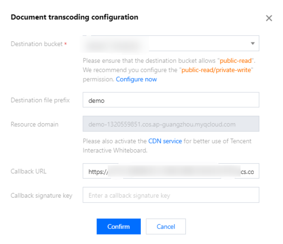 Destination bucket: The bucket is where the Document Transcoding or Real-time Recording resources are stored. If you do not have a bucket yet, you need to go to the COS Console to create one and enable CDN acceleration.