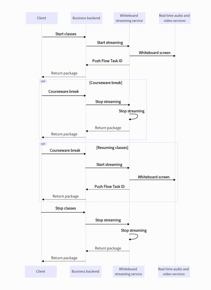 After integrating whiteboard streaming, the following interaction processes generally occur from the start to the end of the class: