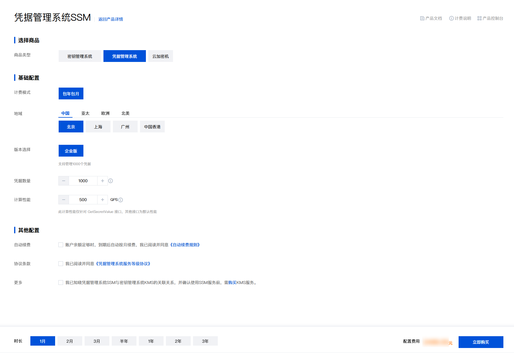 在购买页选择地域、凭据数量、计算性能,阅读并勾选相关费用说明。
