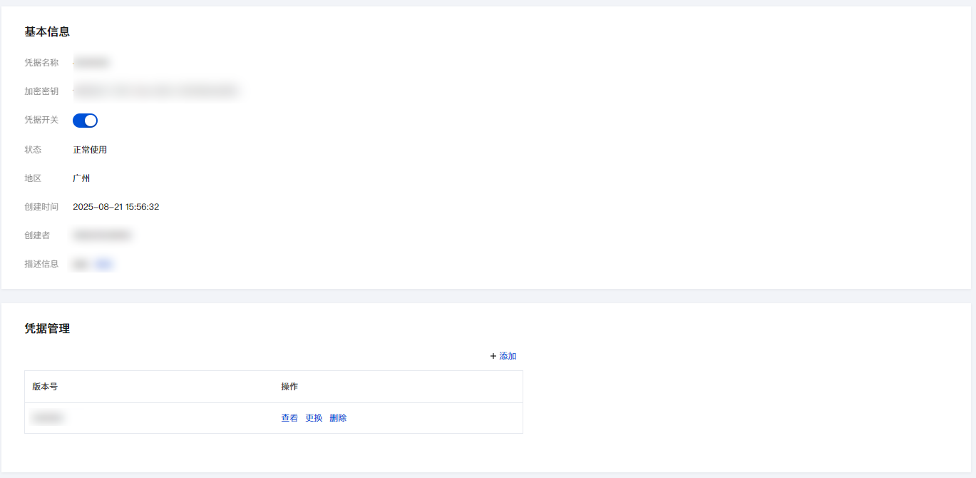 4. 单击凭据名称,进入该凭据的详情页,您可查看凭据的名称、状态、描述信息以及版本号等内容,同时可以对凭据内容进行更改、删除、版本管理等操作。