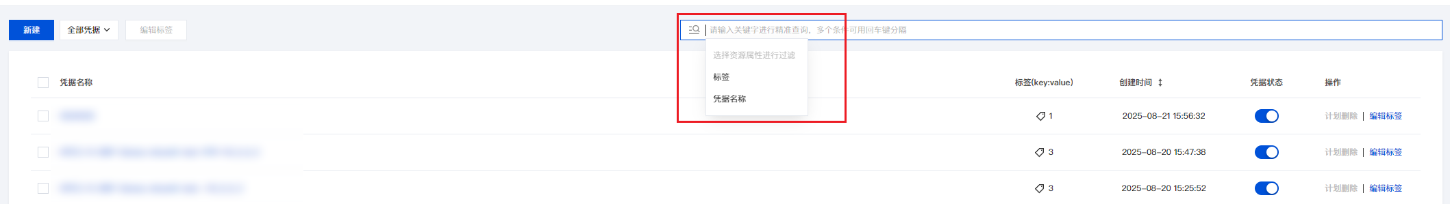 3. 在页面右侧的搜索框中,您可以通过标签或凭据名称进行精准查询,快速找到所需凭据。