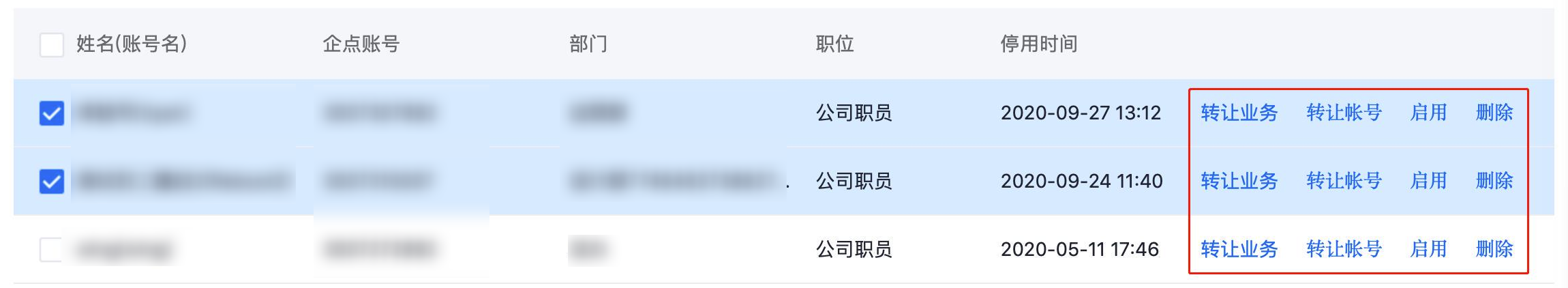 如遇员工业务交接,除停用/启用员工、新增/删除员工操作外,可将员工的关联业务转让给其他员工。
