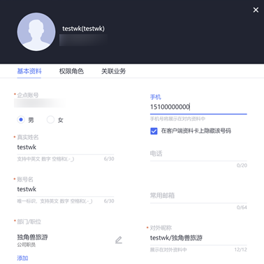 员工手机号码支持隐藏,管理员可以在账户中心企业管理 > 组织架构中,选择员工的资料/权限,在手机号码的下方勾选在客户端资料卡上隐藏,防止员工被骚扰。