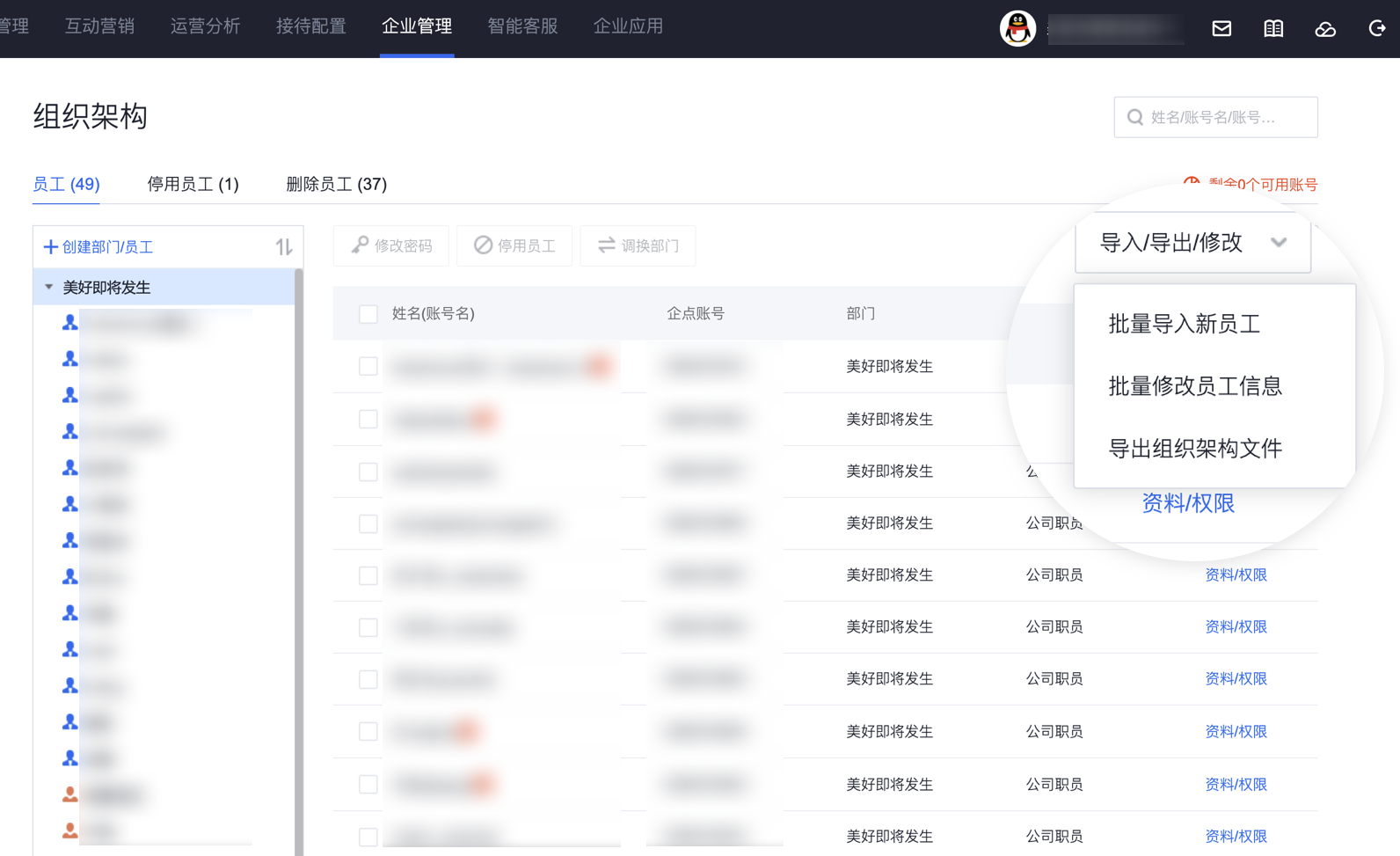 方法1:企点管理员账号或被赋予了管理权限的工号,可在账户中心组织架构中,对工号进行单个或批量的修改密码的操作,如下图所示:
