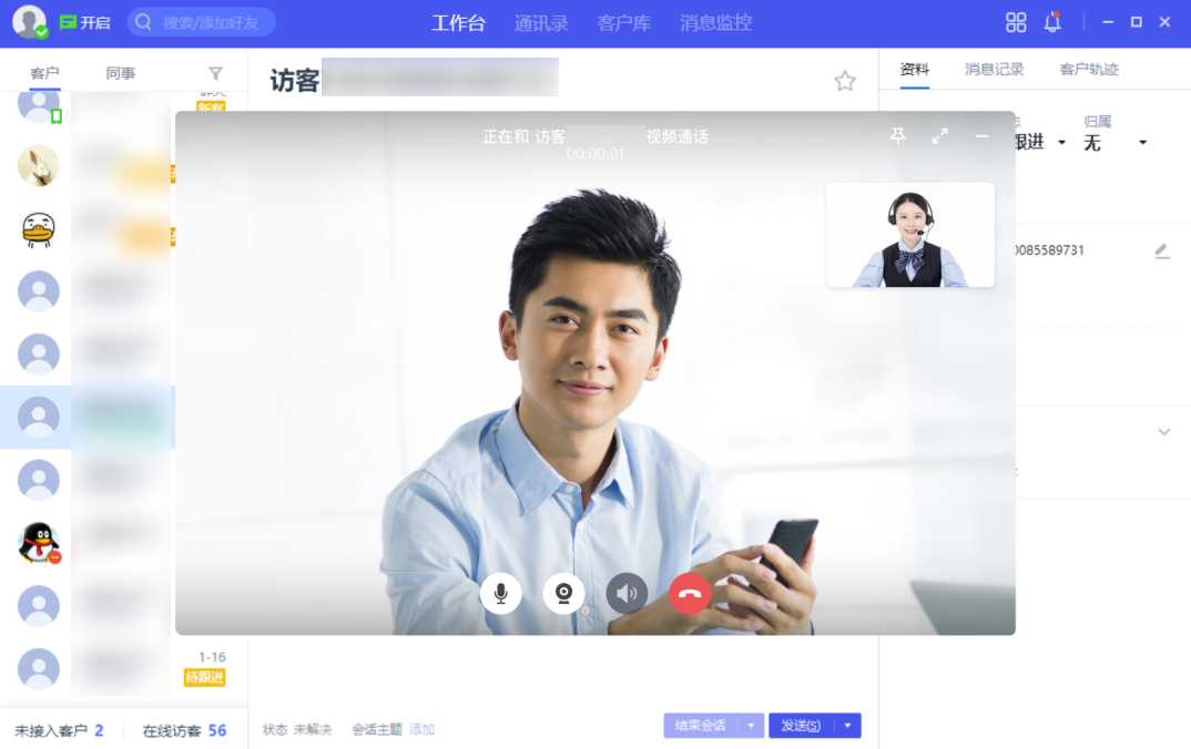 工作台新增视频客服功能,客户可在网页对客服发起视频请求,也能在网页上收到客服发起的视频请求,通过视频可以第一时间高效直达客户诉求。