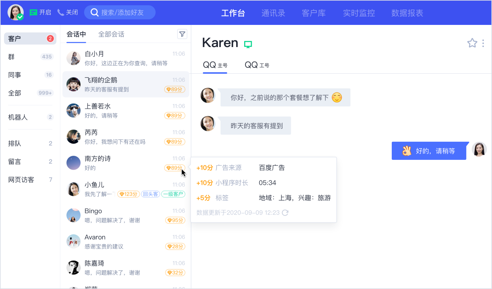 企点客服支持为客户的属性、行为和来源等设置评分规则,提升客户识别精准度及员工接待效率。