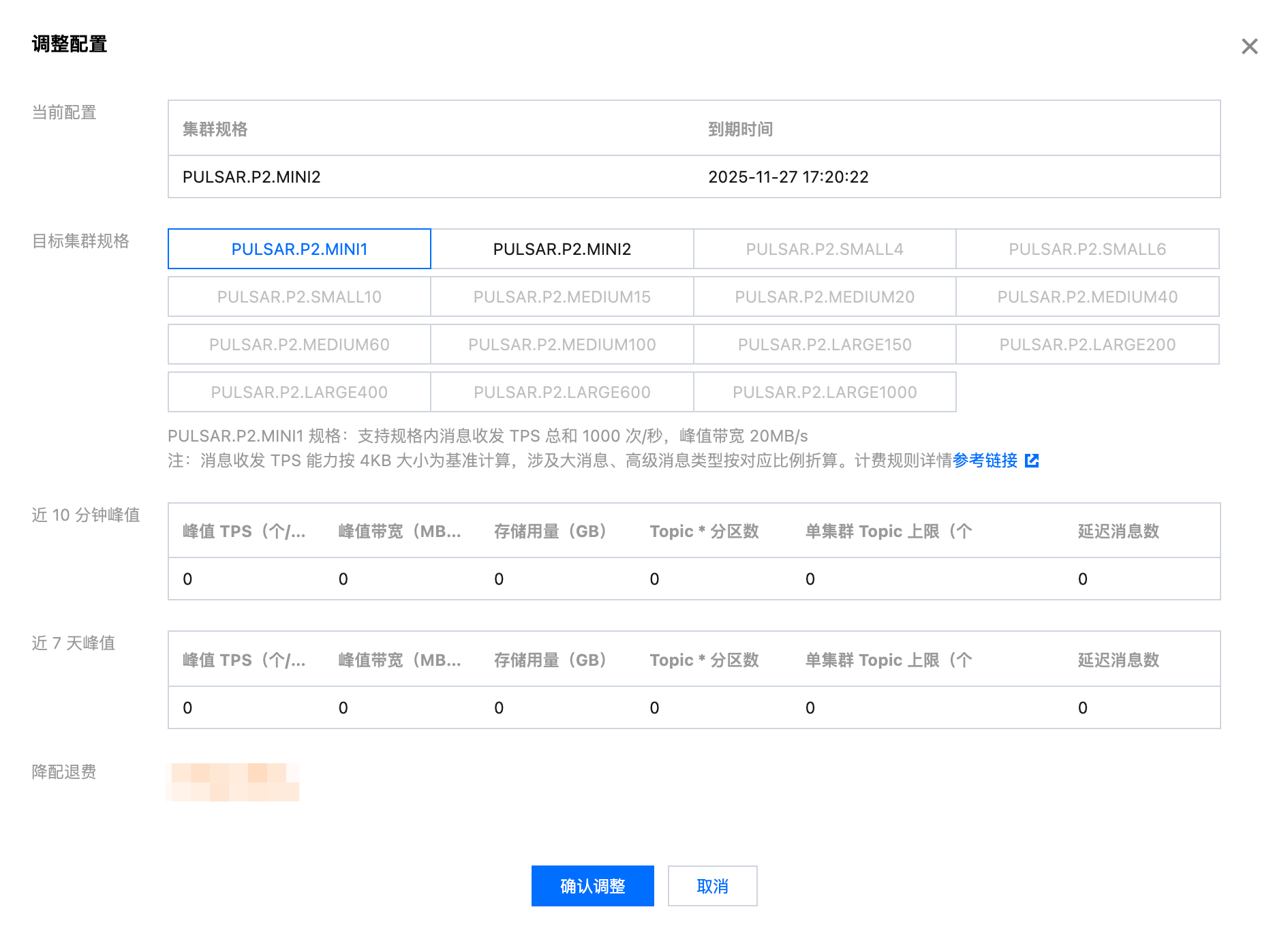 2. 在左侧导航栏选择 pulsar > 集群管理,在集群管理列表页,找到目标集群后,单击操作列的更多 > 降配。