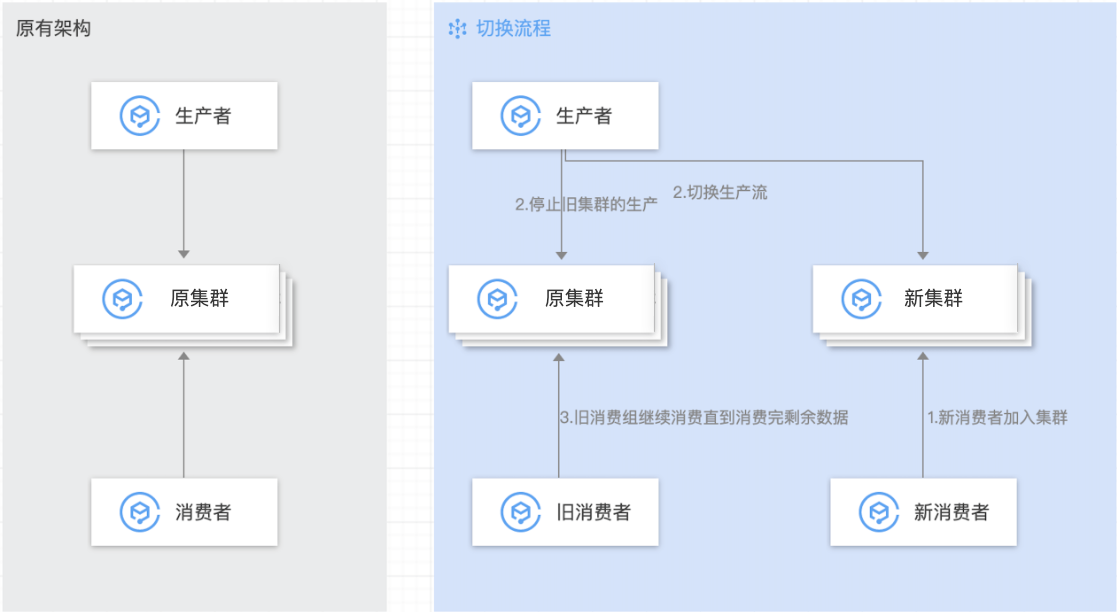 2. 修改原生产者的接入点地址为新集群,并进行重启,使得新消息生产到新集群,直至原集群生产者全部修改/关闭(切写,将生产流量从老集群切换到新集群)。