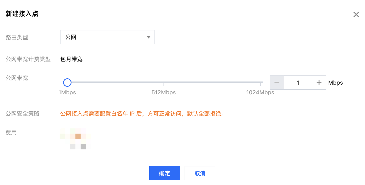 3. 选择接入点页签,单击新建,路由类型选择公网,选择好带宽大小。