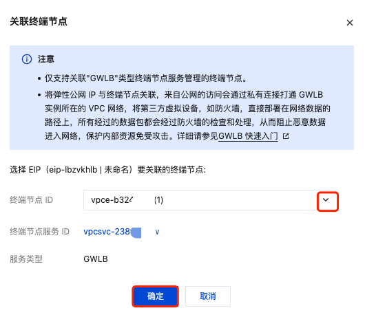 将弹性公网 IP 与终端节点关联,来自公网的访问会通过私有连接打通 GWLB 实例所在的 VPC 网络,将第三方虚拟设备,如防火墙,直接部署在网络数据的路径上,所有经过的数据包都会经过防火墙的检查和处理,从而阻止恶意数据进入网络,保护内部资源免受攻击。详细请参见
