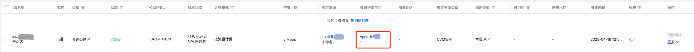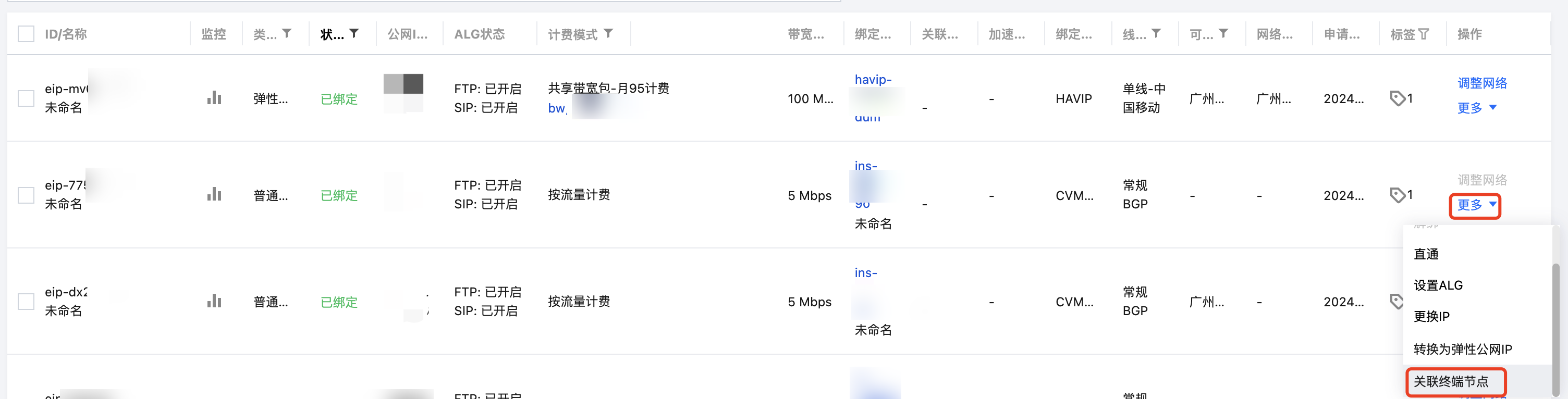 在需要关联终端节点的 EIP 所在行的“操作”列,选择