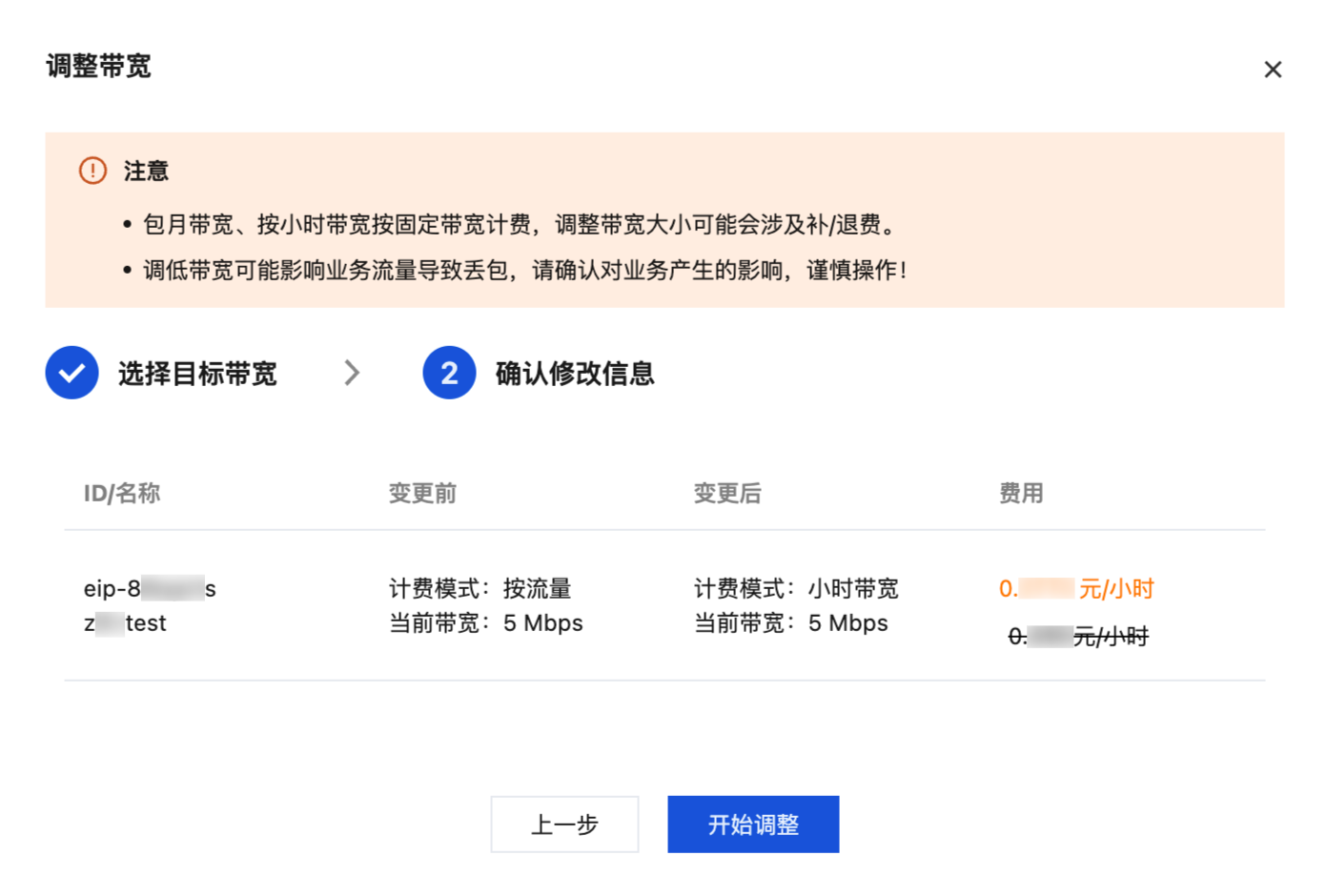 4. 确认变更前、后的计费模式,确认无误后,单击开始调整即可。