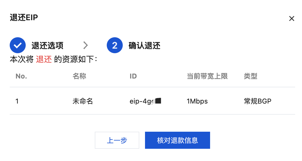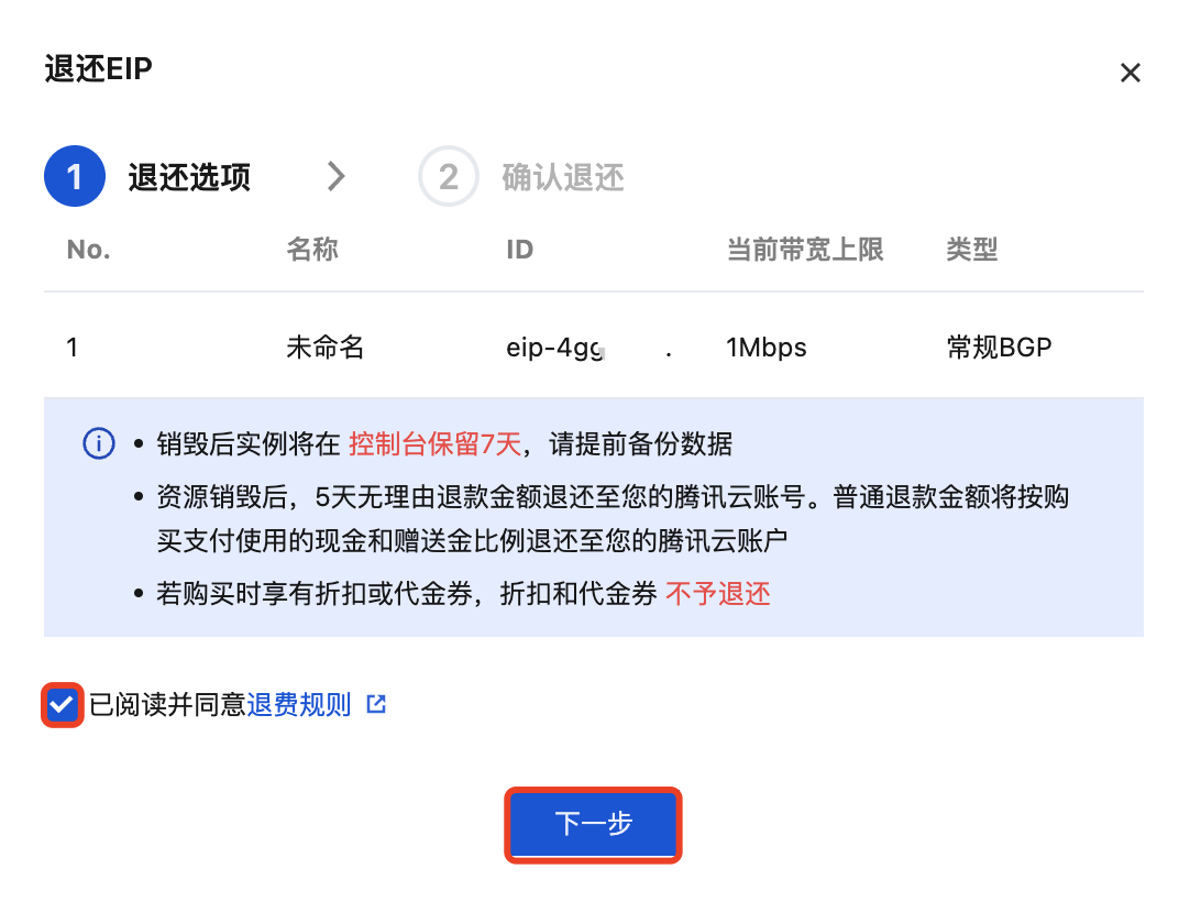 3. 在弹出的退还 EIP 对话框中,了解实例销毁的相关说明,如同意请勾选已阅读并同意退费规则,单击下一步。